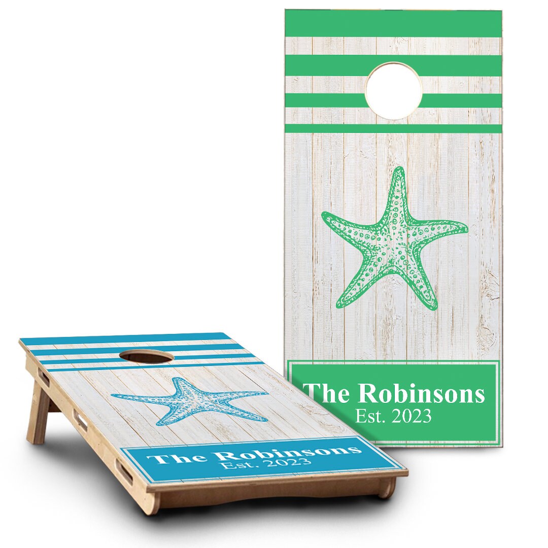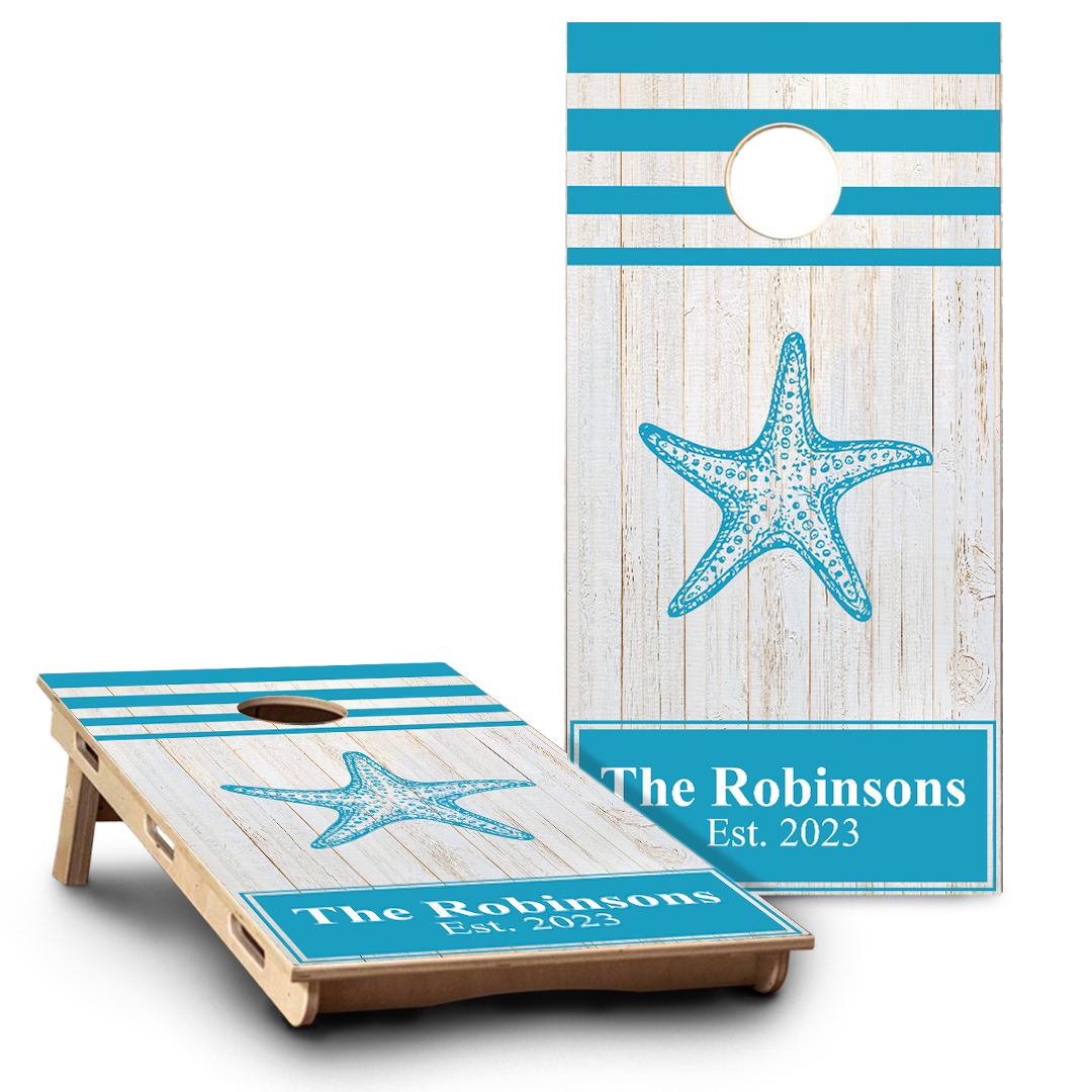 White wood planks star fish & last name | blue & green