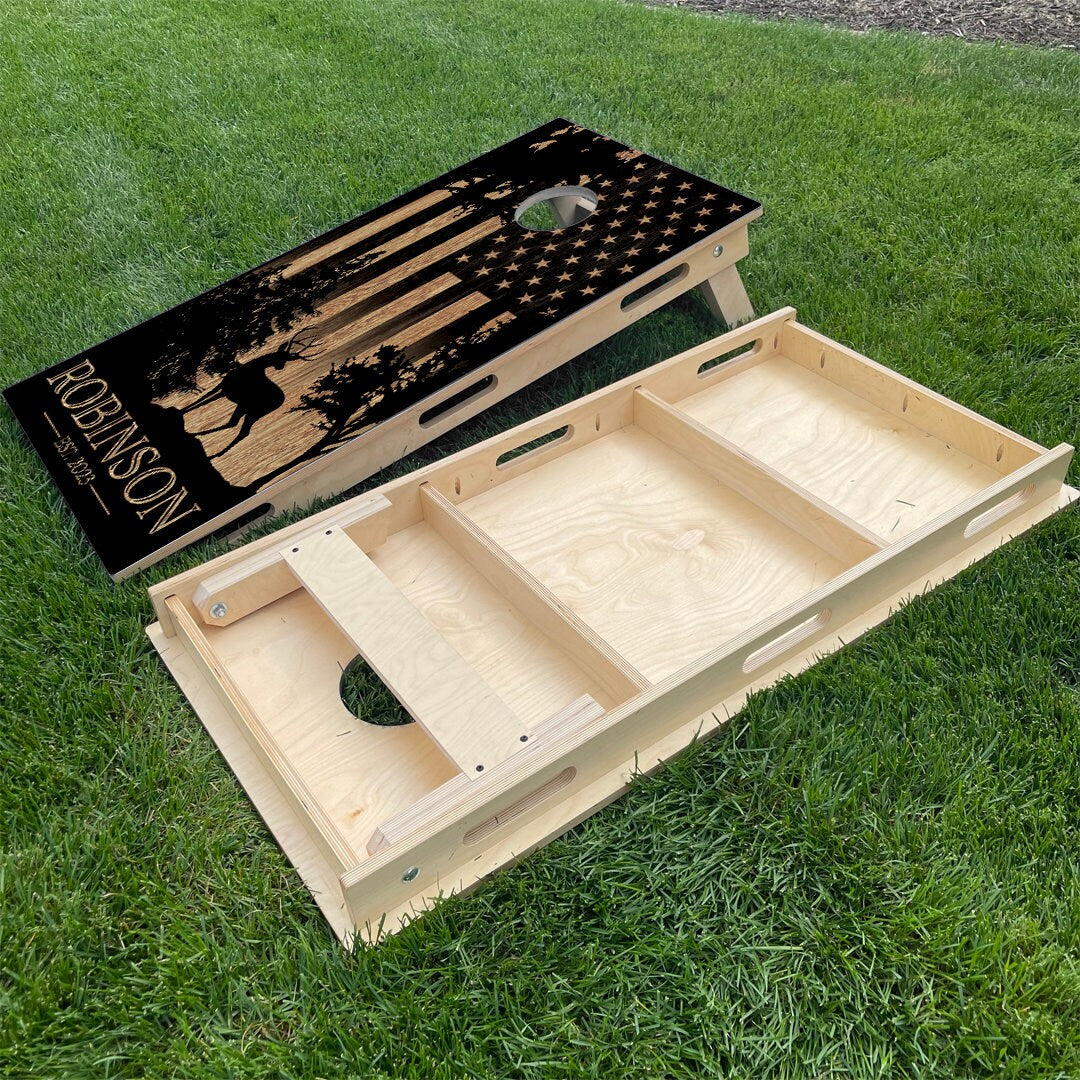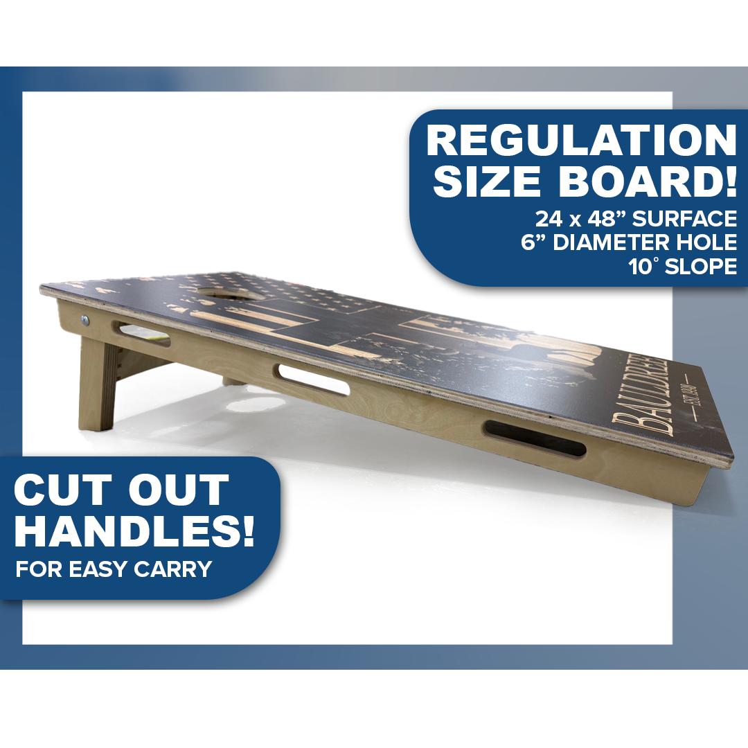 Why wait for custom?! We manufacture and produce all aspects of this cornhole set right here in America in Wisconsin - with FAST processing times & FREE SHIPPING!